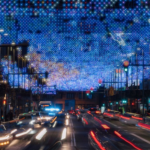 La instalación lumínica, denominada Lucía in the Sky, es un diseño específico realizado por encargo del Ayuntamiento de Madrid para la Gran Vía coincidiendo con finalización de la reforma y peatonalización parcial de la emblemática vía y su inauguración.