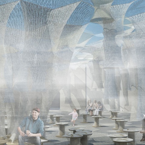 Fabricado con más de 1.000.000 metros de fibra tricotada y robóticamente tejida, Lumen cuenta con dos toldos celulares a gran escala con 250 estructuras tubulares colgantes que crean oportunidades para que los visitantes interactúen con el trabajo. El diseño incorpora 100 taburetes de carrete reciclados de forma robótica y un sistema de nebulización que responde a la proximidad de los visitantes para producir un microclima refrescante. Con una respuesta social y ambientalmente, la arquitectura adaptativa de Lumen se inspira en la ligereza, el juego y la interacción colectiva a medida que la estructura se transforma a lo largo del día y de la noche, respondiendo a la densidad de cuerpos, calor y luz solar. El resultado de la colaboración entre disciplinas, Lumen aplica conocimientos y teorías de la biología, la ciencia de los materiales, la matemática y la ingeniería, integrando materiales de alto rendimiento, conformadores y adaptables en una estructura donde el código, el patrón, la interacción humana, el ambiente, la geometría y la materia Operan juntos.