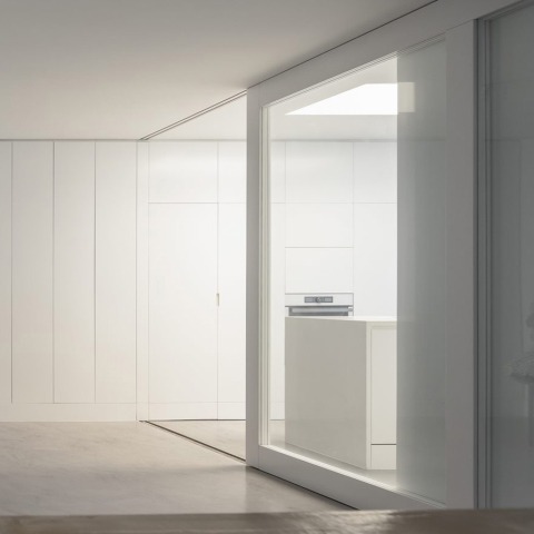 Para su fácil mantenimiento, el microcemento en el suelo, la chapa metálica en las escaleras, los muebles de MDF lacado en colores blanco o negro, y el vidrio, fueron los materiales seleccionados, mientras se da continuidad y unifica la estética sin pretensiones propia de un Loft. La excepción es el azulejo semiacabado, en color verde-pastel, que recubre toda la pared del fondo en la parte trasera y la parte superior del volumen desprendido, reflejando y agrandando la luz natural que los inunda.