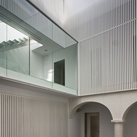 La adecuación de los nuevos espacios se confía a una estructura ligera y unitaria que se introduce en el edificio transformando su sección y entrelazándose con naturalidad con lo preexistente. El patio, nuevo eje de recorridos y circulaciones, se erige en el elemento vertebrador del la casa. El tratamiento mediante celosías de madera combinadas con elementos de vidrio matiza la relación entre vacío, estancias y espacios de circulación, diluyendo sus límites para hacer la casa más leve conforme ascendemos. Transparencias, veladuras, permeabilidades, brillos y reflejos confieren al edificio un carácter público e institucional, distanciado de la imagen más doméstica de la casa original.