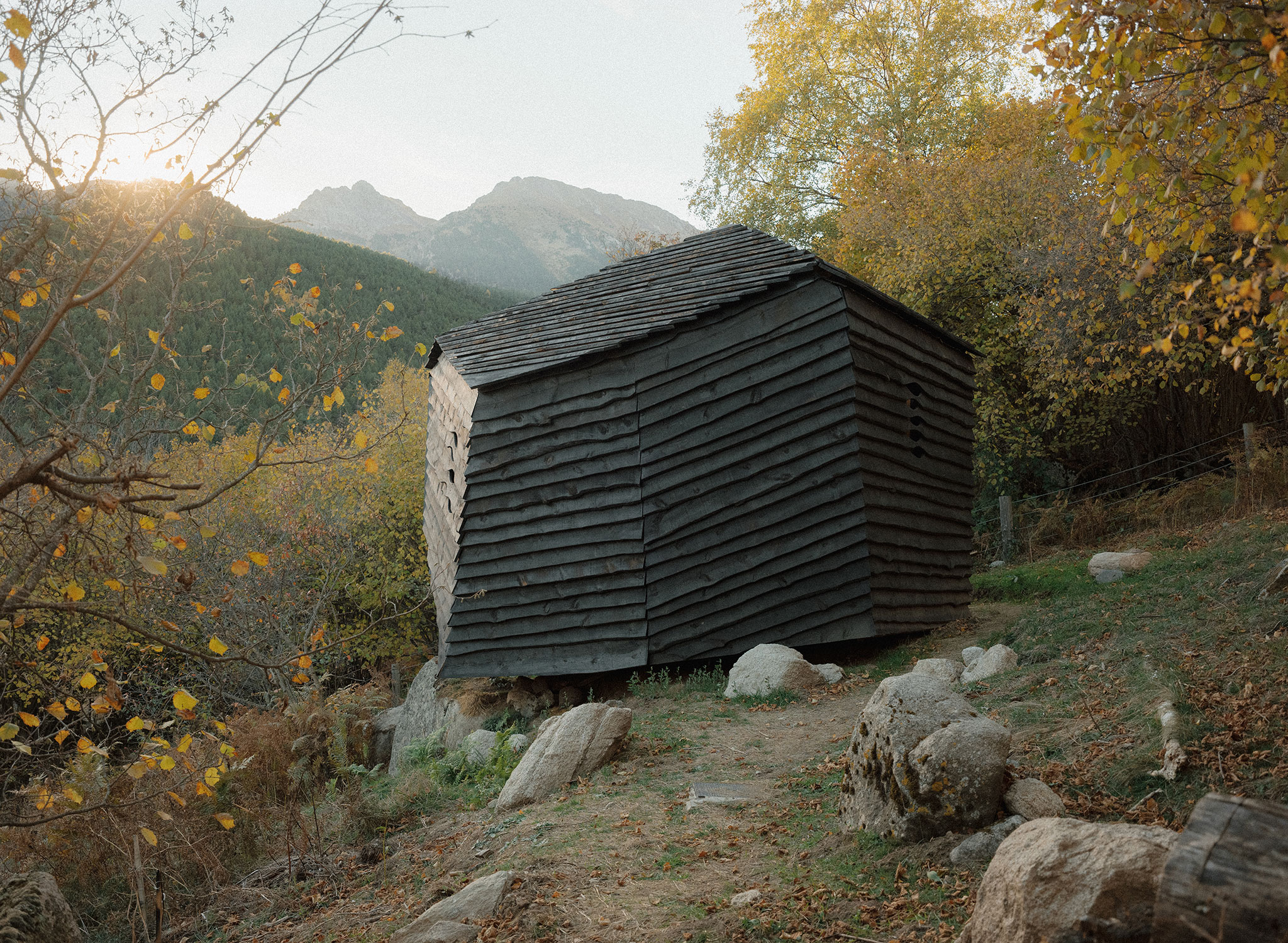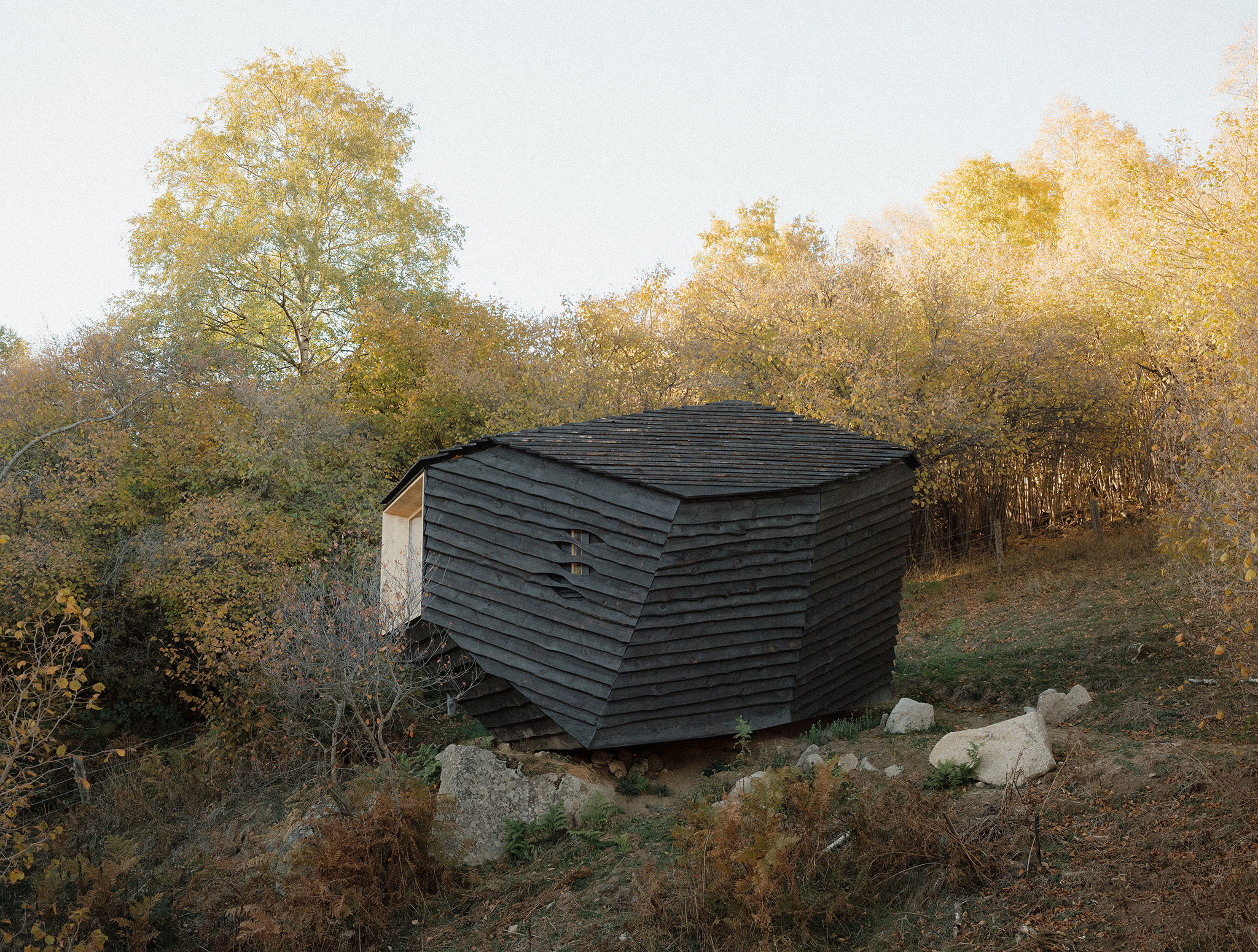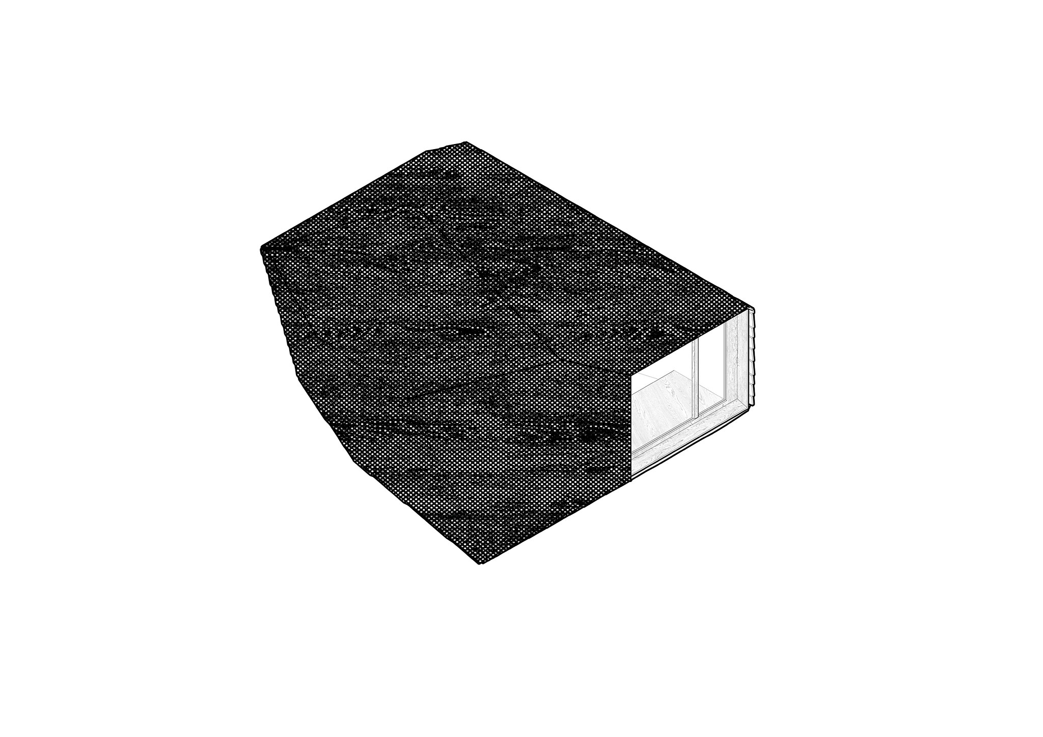 La forma escultórica de la cabaña se inspira en el terreno rocoso de los Pirineos. Concebida como un bloque de piedra que parece haber rodado montaña abajo hasta asentarse de manera natural en el lugar, su geometría facetada está compuesta por muros inclinados y un techo en pendiente que responden a las necesidades programáticas, las condiciones climáticas y la exposición solar. La geometría ajusta sutilmente las alturas de los techos y las proporciones de los espacios para acomodar distintos usos dentro de una planta compacta, mientras que las aberturas cuidadosamente ubicadas enmarcan vistas de las montañas circundantes y permiten la ventilación cruzada. Las contraventanas de madera operables garantizan completa oscuridad por la noche, evitando la contaminación lumínica y apoyando las actividades astronómicas del sitio.