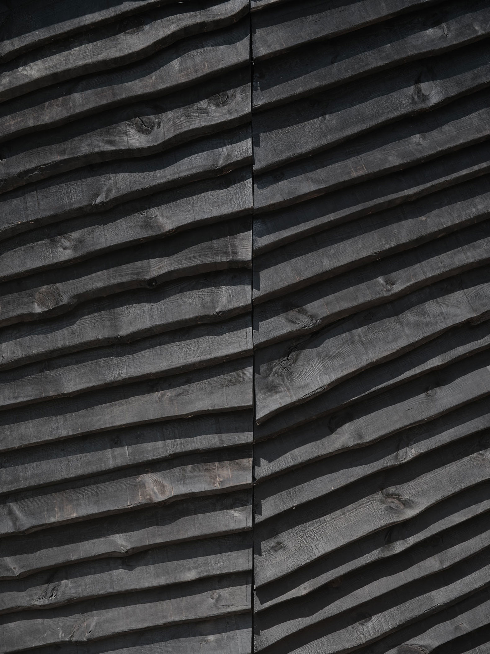 La fachada exterior, formada por tablones de pino con canto natural, ha sido carbonizada siguiendo la técnica japonesa Yakisugi o Shou Sugi Ban (焼杉), que consiste en quemar la capa superficial de la madera para protegerla de insectos, agua, fuego y moho. Estos tablones, cortados a medida y quemados por los propios estudiantes, no solo aumentan la durabilidad del material, sino que también evocan simbólicamente la gestión y prevención de incendios—un aspecto clave de la silvicultura regenerativa en los Pirineos, la cordillera que separa España y Francia y cuyo nombre, Pyros, proviene del griego y significa fuego.