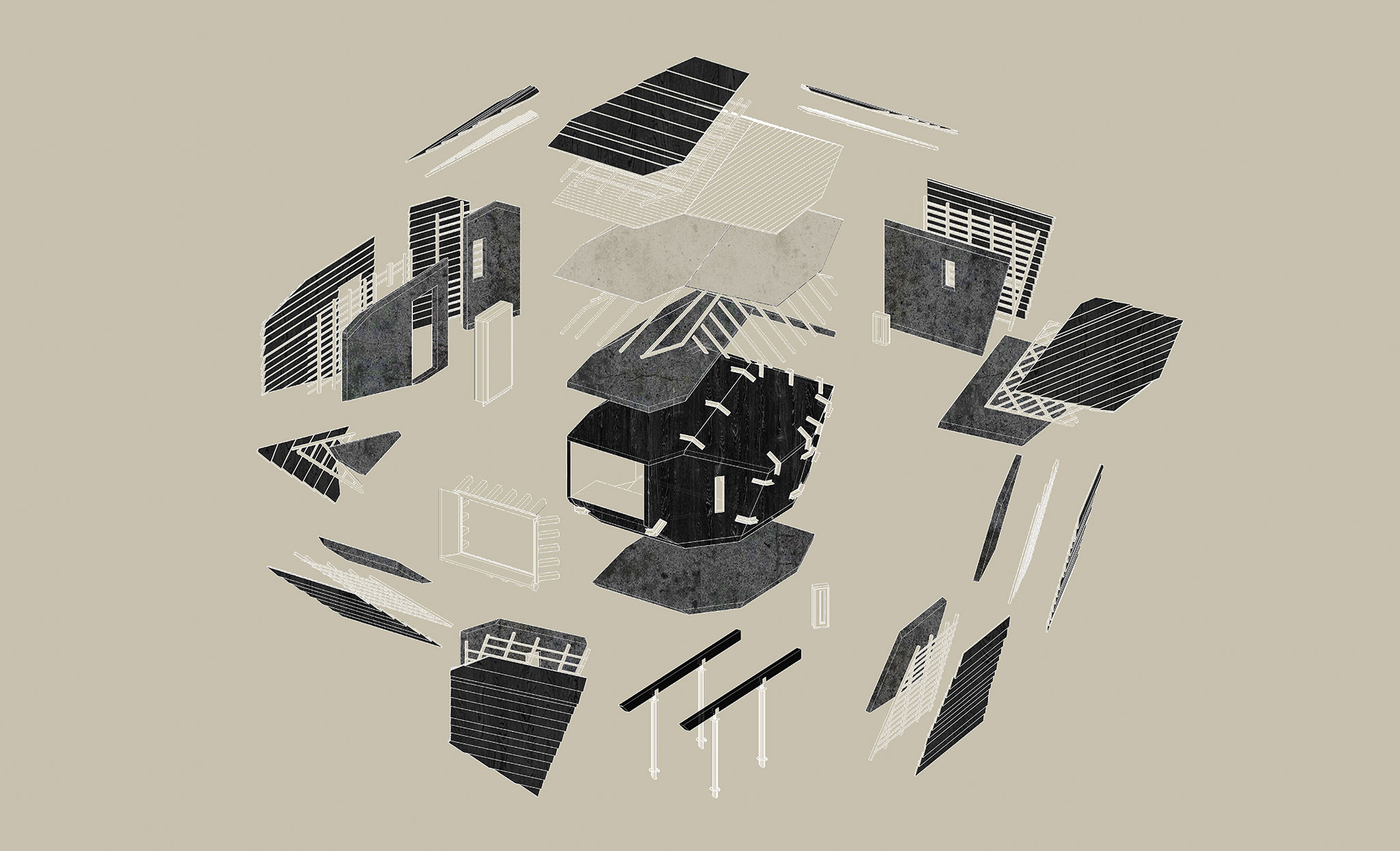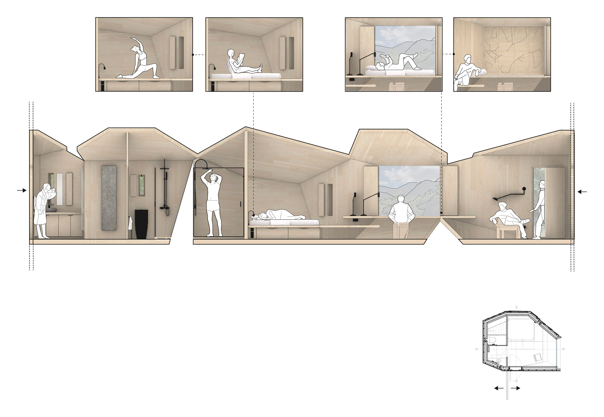 Compuesta por una geometría facetada de muros inclinados y techo en pendiente, la cabaña «Forestone», planteada por el IAAC, responde a las necesidades programáticas, así como a las condiciones climáticas. Se acomodan distintos usos en una planta compacta con zona de descanso, espacio de trabajo y baño, capaz de albergar hasta a dos personas.