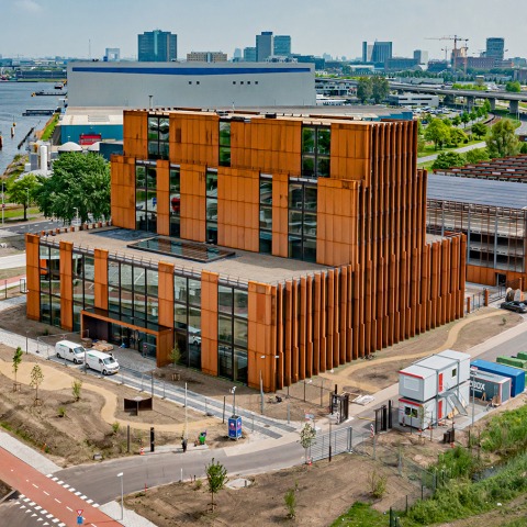 Alliander ahora se encuentra en sus nuevas instalaciones sostenibles. Las nuevas oficinas regionales en Noordzeeweg en puerto oeste de Ámsterdam, proyectadas por De Zwarte Hond, son circulares y flexibles con una construcción de madera. El conjunto consta de un edificio de oficinas, talleres, almacenes, instalaciones de prueba, un edificio educativo y de estacionamiento (total 21.000 m²), para 700 empleados.