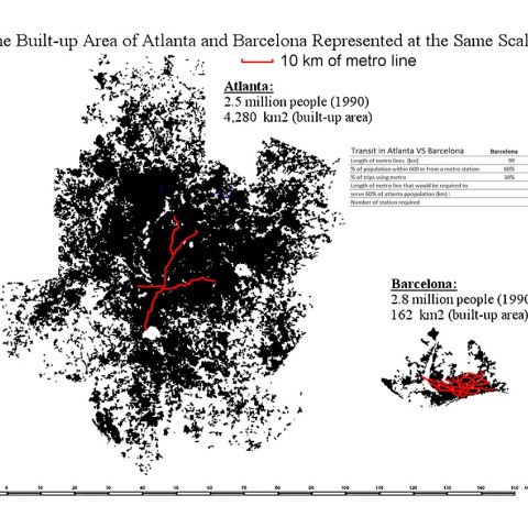 Las densidades urbanas no son una trivialidad, limitan drasticamente la elección del modo de transporte y cambian muy lentamente. Debido a las grandes diferencias de densidades entre Atlanta y Barcelona sobre la misma longitud de una línea de metro se puede acceder al 60% de la población de Barcelona, pero tan sólo al 4% en Atlanta. La baja densidad de Atlanta hacen que esta ciudad sea inadecuada para el tránsito ferroviario.