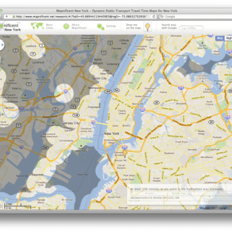 Este software te muestra el área que puedes abarcar con transporte público desde cualquier punto a otro dado en un tiempo determinado. Está disponible para la mayoria de la ciudades de EE.UU y un gran número de ciudades de todo el mundo. ¡Nos descubrimos ante su autor Stefan Wehrmeyer. Enhorabuena!