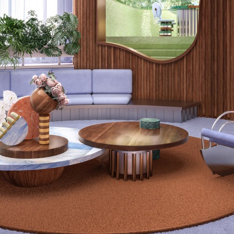Los dos primero productos son la mecedora "Too Much", una mecedora que mezcla contrastes de colores con materiales y formas, y el florero "Ball Pot", que busca generar una emoción singular con su combinación de madera y mármol amarillo.