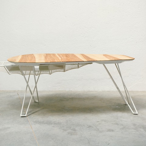 Una microarquitectura realizada por tres artesanos, un ebanista, que ha construido a medida la encimera a base de maderas de fresno macizas, Frank Buschmann de Woodworks. Un herrero que ha fabricado las patas y el cajón deslizante en su parte inferior con estructura metálica en acero tubular lacado en blanco y una red de pescadores 100% de algodón, cosida a mano basándose en técnicas antiguas.