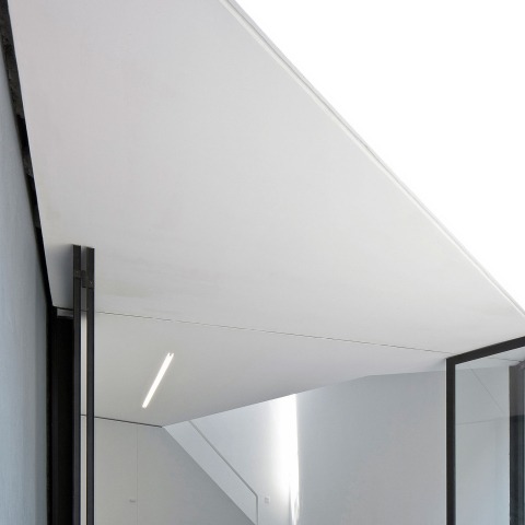 Las losas inclinadas de la cubierta impiden la incidencia directa de los rayos del sol sobre el área de trabajo, permitiendo la entrada sutil de luz uniforme sobre la doble altura que comunica las dos plantas amplificando el espacio.