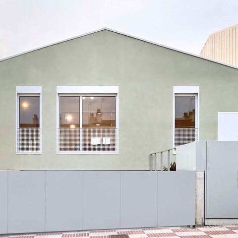 Encima se construye la casa con piezas de hormigón prefabricado que, a modo de grandes jácenas, salvan la luz del basamento. Para optimizar costes de construcción, los paneles se presentan al interior sin revestimiento, con un acabado pulido tipo terrazo. Un sistema de zócalos, esquineras y frisos de madera son la respuesta para resolver la junta correctamente, otorgando al sistema un carácter doméstico.