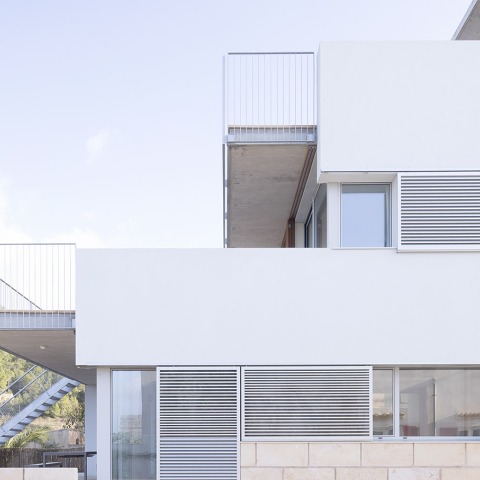 La casa tiene tres fachadas. A la calle de acceso, la escala y las proporciones nos relacionan con sus vecinos. Sobre la calle lateral, que recoge la secuencia de habitaciones y piezas pequeñas, la composición intenta un diálogo entre ventanas, persianas correderas y muros. La dualidad de colores intenta recoger ventanas y correderas en una unidad.