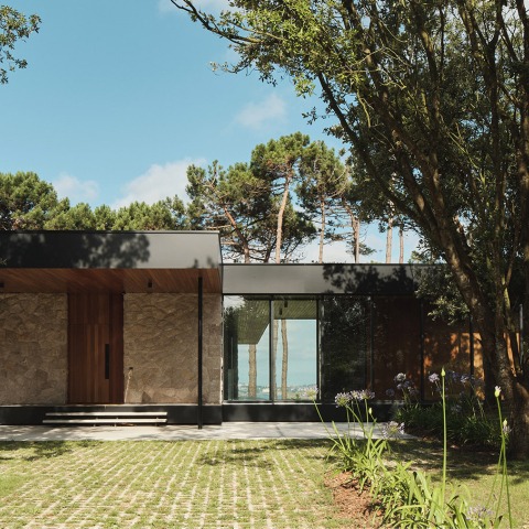 Esta disposición se hace evidente en la entrada de la vivienda, donde ambas alas confluyen. El juego de llenos y vacíos, junto con las transparencias, permite que el mar sea visible desde el acceso, reforzando la conexión con el paisaje.