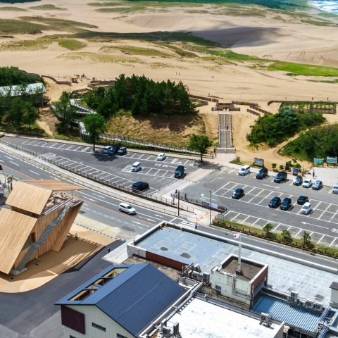 Proyectamos un observatorio y una cafetería con vista a las dunas de arena de Tottori, utilizando abundantemente la madera en una estructura híbrida de madera contralaminada, y hormigón armado. Usando CLT, que tiene una textura cálida y que armoniza con el color de la arena de las dunas, traté de crear una «escalera al cielo».