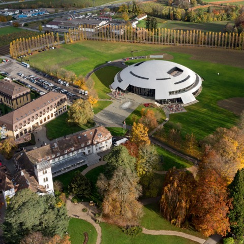 ¿Cómo puede una sala filarmónica de última generación combinarse con la sostenibilidad como principal objetivo? Ubicada bajo una cúpula de metal reflectante, la sala de conciertos de 900 butacas se hace enteramente de paneles OSB de madera reciclada, junto con una ventilación mecánica natural (por requisitos de sostenibilidad local, no hay aire acondicionado). Situado junto al Lago Ginebra en el colegio internado internacional Le Rosey, la sala de conciertos y centro de arte aporta al campus histórico una imagen arquitectónica contemporánea, mientras que desarrolla nuevas relaciones con la ciudad circundante a través de las artes.