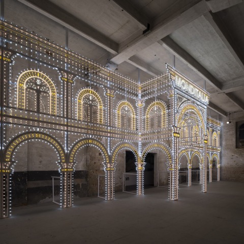 Los visitantes del Arsenale podrán realizar su llegada a lo grande este año, cortesía de la luminaria, a través de una instalación de entrada por Rem Koolhaas / OMA y Swarovskia. Esta instalación arco está hecho de miles de bombillas de colores y cristales de Swarovski en una instalación de iluminación urbana a gran escala, haciendo referencia a la cultura italiana y el programa Monditalia del interior, aunque sinceramente a nostros nos recuerda más a la Entrada de la Fería de Sevilla.