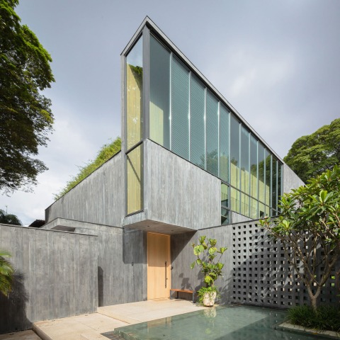 El volumen es hermético hacia la calle, destacando únicamente un cuerpo vidriado que actúa como farola del barrio. Se accede a la propiedad a través de un patio duro con espejo de agua, con muros de hormigón negro que resaltan el color de la vegetación.
