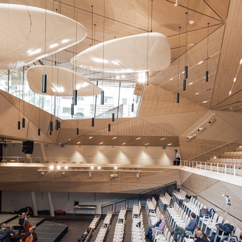 Las reflexiones tempranas de la reverberación son necesarias para proporcionar una excelente inteligibilidad del habla, claridad musical, presencia y la sensación de estar envuelto acústicamente por la música. Los proporcionará naturalmente la topografía interior optimizada de la sala, para reflejar el sonido del escenario a cada parte de la audiencia. Las superficies como los frentes inclinados de los balcones y el techo escultórico de madera envuelven el espacio como una ola que se eleva desde el suelo para dar a la audiencia la sensación de estar dentro de una ola de música que se ve aumentada visual y acústicamente por la geometría interior de la sala. Además, el reflector acústico suspendido guía el sonido de los músicos para llegar a los oyentes con la intensidad, la dirección y el tiempo necesarios para crear una experiencia acústica envolvente e inmersiva.