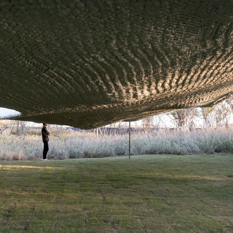 Primero intentamos definir la forma curva del dosel a través de la búsqueda y optimización de la forma física paramétrica, sin embargo, el resultado fue demasiado monótono. Por lo tanto, recurrimos a otras opciones para resolver la deformación estructural. A través de una serie de experimentos específicos sobre cómo trabajaban los materiales, los arquitectos y el ingeniero estructural decidieron recoger una red de nylon para reforzar el cuerpo de espuma de poliuretano.