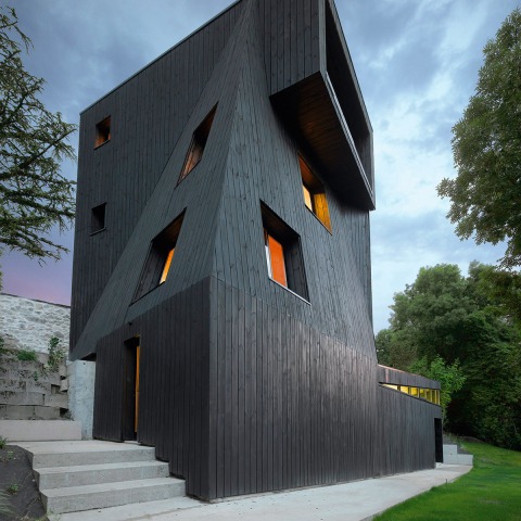 Su singular color emerge entre las copas de los árboles y contrastando contra sus vecinos tradicionales, la estructura da una respuesta a la topografía empinada y estrecha, donde el objetivo principal era enmarcar las estupendas vistas del valle.