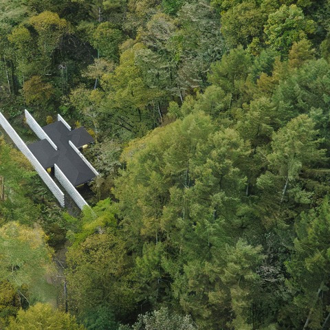 Una residencia privada en Karuizawa, Nagano. Situada a lo largo de la carretera se encuentra esta distintiva propiedad triangular que se extiende 110 m de longitud. Una solución creativa era esencial para garantizar la privacidad del tráfico y de los peatones, al mismo tiempo que actuaba como contraste para disfrutar del entorno natural.