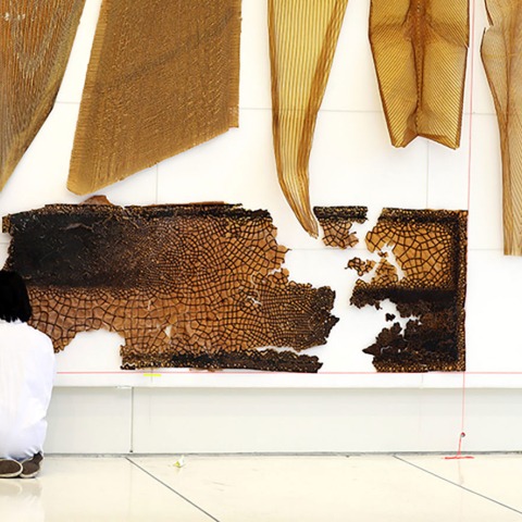 La pieza central de la exposición es Pabellón de seda II de Oxman, una comisión específica para el sitio que se exhibe por primera vez en el Museo de Arte Moderno, que continúa la investigación de Oxman sobre la relación entre la fabricación digital y biológica a escala arquitectónica, que inició en 2013. Aprovechando la capacidad de los gusanos de seda para generar un capullo 3-D a partir de un solo hilo de seda, Oxman y su grupo de investigación crearon la geometría general de una cúpula geodésica mediante el uso de un algoritmo que asigna un solo hilo continuo a través de parches que brindan diversos grados de densidad. .