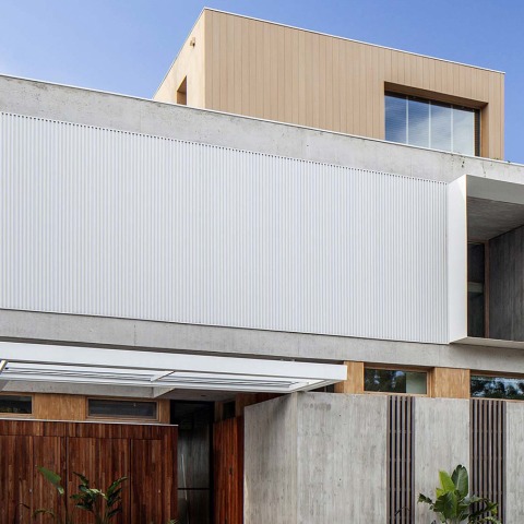 La constitución material de la vivienda está basada en la utilización de materiales de poco mantenimiento y nobles, junto con detalles simples y sintéticos; estructura de hormigón, revestimientos de chapa blanca, pisos de tundra grey, carpinterías de PVC similar a la madera y revestimientos de madera de Lapacho y WPC.