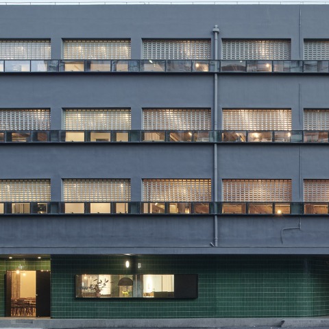 La primera estrategia de renovación fue una reelaboración de la fachada principal, para cambiar por completo sus proporciones y lectura, sin grandes alteraciones estructurales. Las ventanas repetitivas y superficiales del edificio existente están parcialmente rellenas con ladrillos de vidrio, mientras que la parte inferior de las nuevas ventanas operables está unida con un marco de metal negro unificador, creando la ilusión de largas ventanas de cinta horizontal. Mientras que toda la parte superior del edificio recibe una capa de pintura gris oscuro, la planta baja presenta un tratamiento de material diferente. Los azulejos verdes vidriados definen la escalera redondeada que ancla un extremo del edificio y continúa a través de la pared ondulada en la base, que entra y sale para indicar los puntos de acceso. Se agrega un dosel profundo en la parte superior de la planta baja para realzar la división de materiales y ofrecer un gesto de bienvenida en el nivel de la calle.