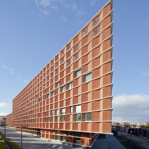 La fachada, extraordinariamente sistemática, repite las mismas lamas, piezas cerámicas y ventanas por todo el edificio. Sin embargo, las ventanas se salpican de forma aparentemente desordenada resolviendo de forma eficaz la iluminación de los diversos usos y acentuando la voluntad de mostrar la diversidad que defiende el diseño.