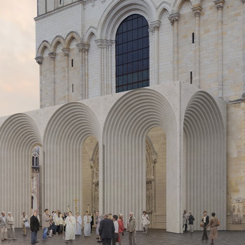 Las primeras imágenes y maquetas muestran una construcción mínima, perforada por 5 arcos, inscribiéndose en una continuidad histórica, en coherencia con el sitio, sin apoyarse estructuralmente en la catedral (catalogada en 1862 como monumento histórico), creando una galería abierta a través de la cual se verán parcialmente las esculturas multicolores del portal.