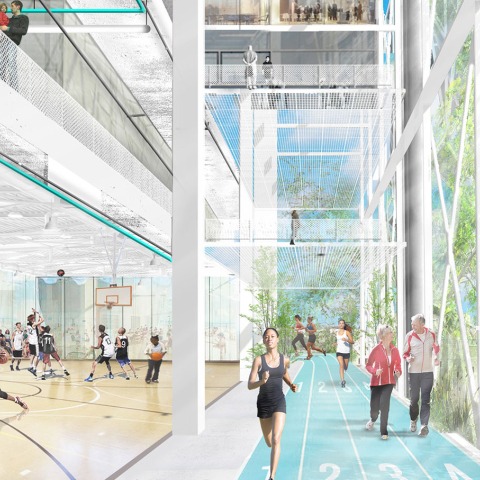 El bloque superior del edificio está dedicado a la vivienda. Las unidades residenciales están orientadas al exterior, disfrutando de unas vistas privilegiadas de la ciudad y de la laguna. Un sistema modular permite la combinación de unidades de diferentes tamaños, que van desde 46 a 140 m2. La reducida dimensión de los micro apartamentos se compensa con instalaciones comunes interiores y exteriores, específicamente concebidas para fomentar el sentido de comunidad de los residentes. Las unidades residenciales están dispuestas en torno a un patio común, donde la vegetación ayudará a refrescar el microclima interior, manteniendo los niveles adecuados de temperatura y humedad para lograr el confort de los usuarios.