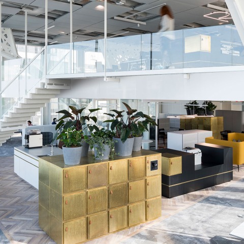 El plan es abierto, ligero y fomenta la interacción. Los lugares de trabajo hechos a medida son ajustables en altura y todos están ubicados en el mismo piso para estimular la interacción. Instale a lo largo de las ventanas de doble altura para permitir una luz natural óptima, asegurando un mínimo de iluminación adicional necesaria. En las áreas medias menos iluminadas y, por lo tanto, más íntimas, existen diferentes usos para acomodar las diversas actividades de trabajo. En el piso superior, los bancos y mesas especiales están integrados en el techo y ofrecen una capacidad de asiento instantánea con solo presionar un botón. Esta flexibilidad también se encuentra en los armarios móviles tapizados, que sirven como pantallas acústicas. Este alto nivel de personalización es líder en el diseño y se utiliza como una parte decisiva, estimulante y móvil del interior.