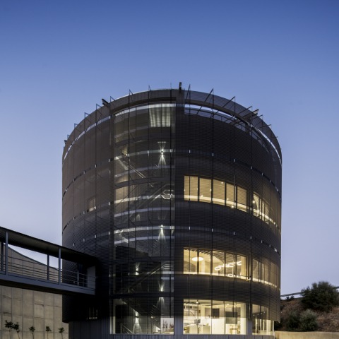 Los arquitectos Lola Moral Mata y Miguel Velasco Serrano han sido los encargados del diseño de la nueva sede de Silos Córdoba, compuesta por dos volúmenes: el primero, de 10.000 m² de superficie, que comprende las actividades más logísticas, y el segundo, que concentra todas las oficinas en un espacio cilíndrico que desde fuera recuerda de forma obvia a los silos de almacenaje de grano, y por dentro se articula en torno a un vacío definido por la luz que entra en el edificio.