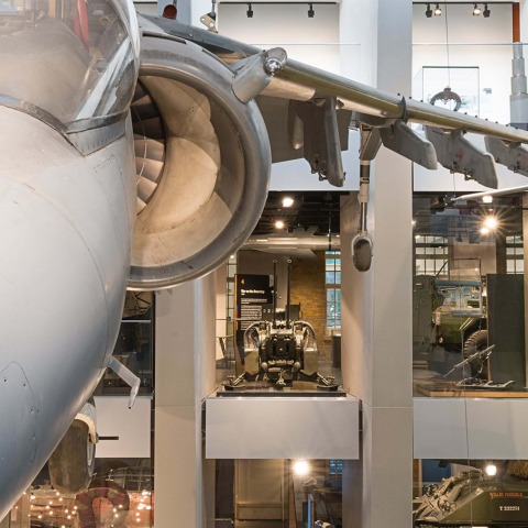 El corazón del edificio es el nuevo y amplio atrio, que proporciona un nuevo espacio espectacular para ver los objetos más grandes de la colección del Museo. La relación entre estas exposiciones y las galerías circundantes, han sido redefinidas por completo - por primera vez, se suspenden la exposición del jet Harrier, Spitfire (Avión de guerra), el cohete V2 y otros objetos irónicos, para sustituirlos por una nueva exposición que corresponda a la nueva galería, en cada una de las plantas.