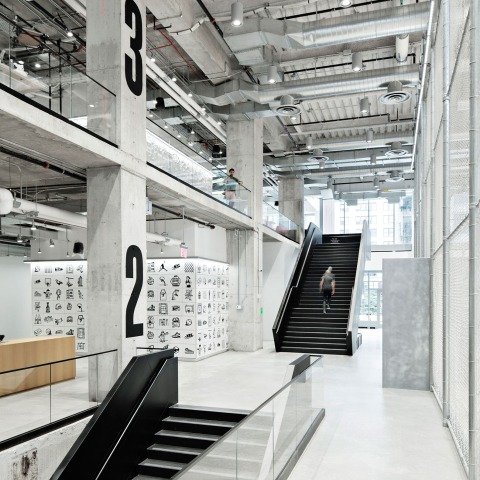 Las piezas mas notables incluyen: una pared con una corteza de más de 9 metros de alto que referencia las raíces en Oregon de Nike; Alfombras personalizadas hechas a mano en varios espacios, uno de los cuales -en el salón VIP Jeter- cuenta con todos los años de campeonato de los Yankees; Patrones de suelo derivados de las líneas de la cancha y los puentes de Nueva York se derraman en los Showrooms VIP; patrones corriendo y del baloncesto inspiran los azulejos de la pared modelados en CNC; los azulejos del techo de la sala de conferencias parecidos a las suelas de los zapatos; Una pared de azulejos formando un mosaico de Michael Jordan; Patrones perforados personalizados del armario; Y la dirección de arte y comisariado de toda la ilustración y la fotografía para las cabinas de reunión.