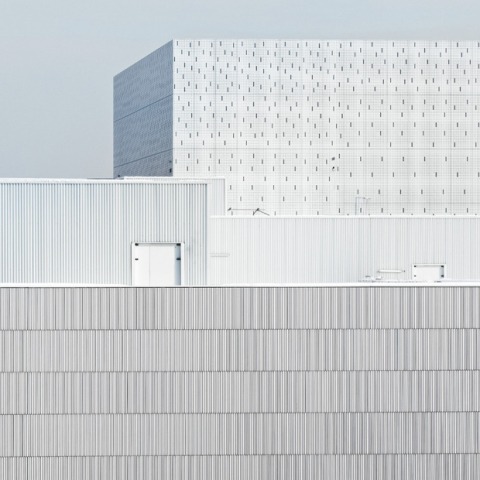 Aunque se supone que el edificio está perfectamente sellado, el énfasis en la luz natural está en el corazón del proyecto. La fachada de cerámica blanca presenta un patrón hueco alternado que suaviza el aspecto defensivo del edificio y crea una vibración que depende de la cantidad de luz solar. Esta relación con la luz natural también se muestra en el interior del edificio, donde un vacío triangular se convierte en un patio con plantas abierto para el personal.
