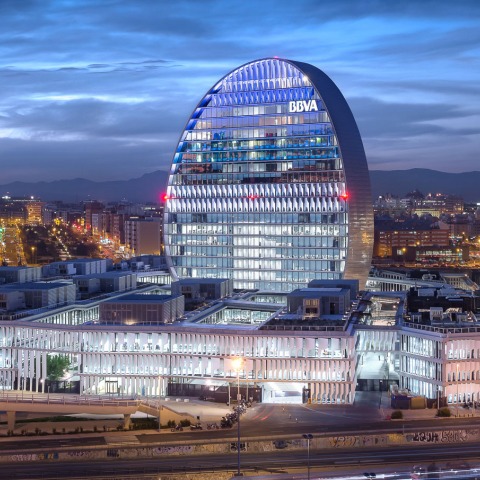 La última sede de BBVA se encuentra en la periferia al norte de Madrid. El sitio se encuentra frente a la autopista y está rodeado de oficinas de nueva construcción, edificios comerciales y urbanizaciones residenciales. Cuando el banco adquirió el terreno, ocho edificios inacabados de oficinas ocupaban una porción sustancial del mismo, y estos edificios existentes fueron incorporados lo máximo posible al nuevo desarrollo.