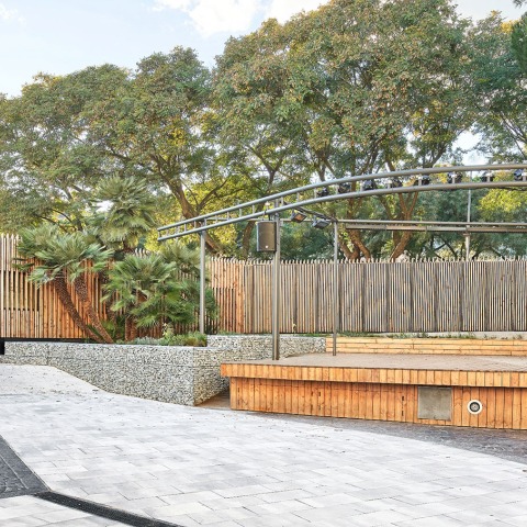 Adyacente al pabellón de acceso se crea una zona de tarima elevada a modo de teatro al aire libre, para aprovechar al máximo los espacios de la intervención. Uno de los deseos del proyecto era preservar el entorno, por esta razón se prestó especial atención al arbolado existente y al rediseño de los jardines, lo que permitió crear una atmósfera natural y acogedora.
