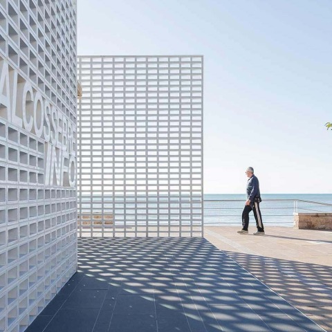 En la oficina de turismo el proyecto se inspira en la celosía mediterránea, usada en muchos de los edificios de costa de los años 60 y 70. Se coloca una celosía cerámica esmaltada en blanco formando 3 muros semi-transparentes de diferentes longitudes alrededor del edificio para darle más entidad. Estas celosías filtran las luces, las vistas y las brisas, mejorando el confort térmico y lumínico, ofreciendo un nuevo paisaje urbano.