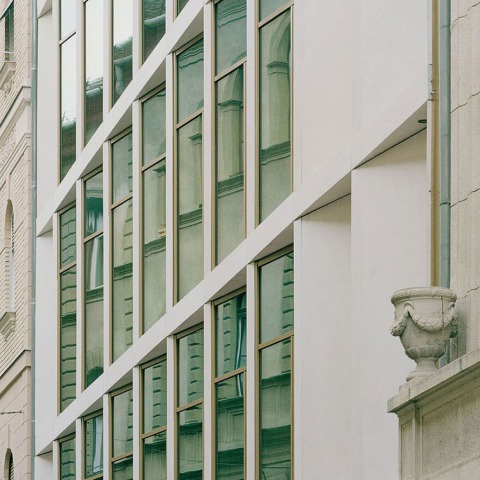 El edificio sigue y capta la fuerte axialidad y el ritmo característico de las fachadas de los edificios del barrio. Debido a la estrechez de la calle, la fachada principal sólo puede verse de lado. Así que la geometría en zig-zag evoca los efectos de sombra de los edificios históricos y da al edificio un aspecto de dos caras en la estrecha calle. La combinación de elementos prefabricados de hormigón lisos y texturados articula la fachada, que combina con el color del edificio existente. Tanto en la fachada de la calle como en la del patio, la retícula es una abstracción que sigue la propia estructura del edificio y responde sutilmente al esquema del edificio existente.