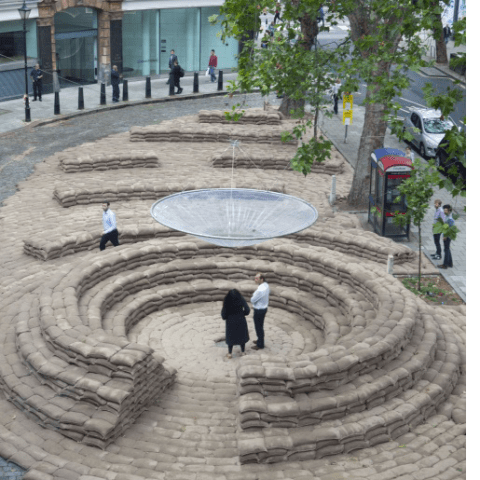 Los sacos de arena se usan a modo de material low-cost, como un bloque ready-made que transforma el lugar con una nueva superficie, creando diferentes series de espacios, bancos y un anfiteatro de 120 asientos cubierto por una piscina de agua suspendida. Esta piscina, formada por un anillo de acero que soporta una membrana de material transparente, distorsiona las vistas de los árboles, los edificos y el cielo sobre el anfiteatro. Una vez el espacio retome su uso, la arena sera donada para ser usados en los parques infantiles de Candem.