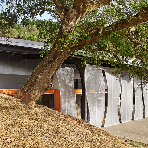 El diseño ambiental de Odette Estate Winery expresa el compromiso del propietario con la agricultura sostenible y la producción de vino. Juancarlos Fernández, socio de Signum Architecture, con sede en el Valle de Napa, diseñó las instalaciones de Odette para reflejar la elegancia de los vinos creados allí. Ubicado en las colinas orientales del valle, el techo vivo del edificio parece haber sido levantado de la tierra. En la parte delantera del edificio, las pantallas corredizas de aluminio perforadas en formas altas y voluptuosas cubren el espacio de trabajo al aire libre de la bodega cubierta de la bodega. Detrás de estas pantallas, tres contenedores de envío reutilizados sirven como espacio de oficina y laboratorio de bodega cómodo y sofisticado.