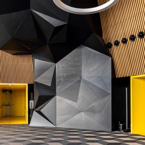 La sala de eventos del rascacielos luce un revestimiento tridimensional muy complejo a nivel técnico resuelto con bambú y tableros fenólicos contrachapados.