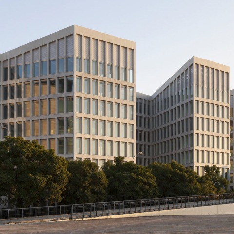 Una crujía homogénea de 12.40 metros, sin pilares intermedios, idónea para uso administrativo, da forma a los cuerpos edificatorios de ocho plantas que se entrelazan, generando una figura singular. La edificación, al prolongarse hasta el perímetro del solar, define las alineaciones de las calles sin perjudicar a los edificios vecinos.