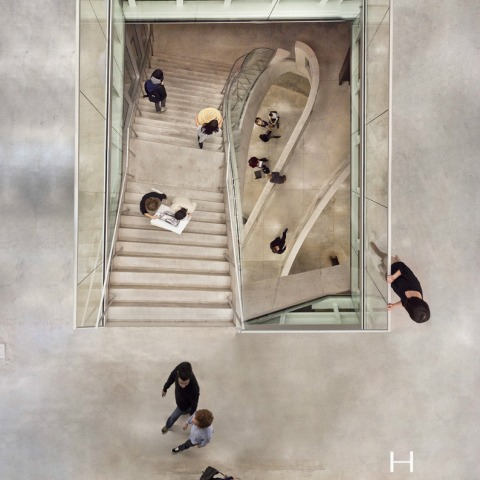 Imágenes a vista de pájaro, como si de un plano o maquetas se tratase. Brett Beyer fotógrafo recibio el encargo de la Cornell University de Nueva York, para realizar una serie fotográfica del interior del Milstein Hall, una de las últimas obras de OMA.