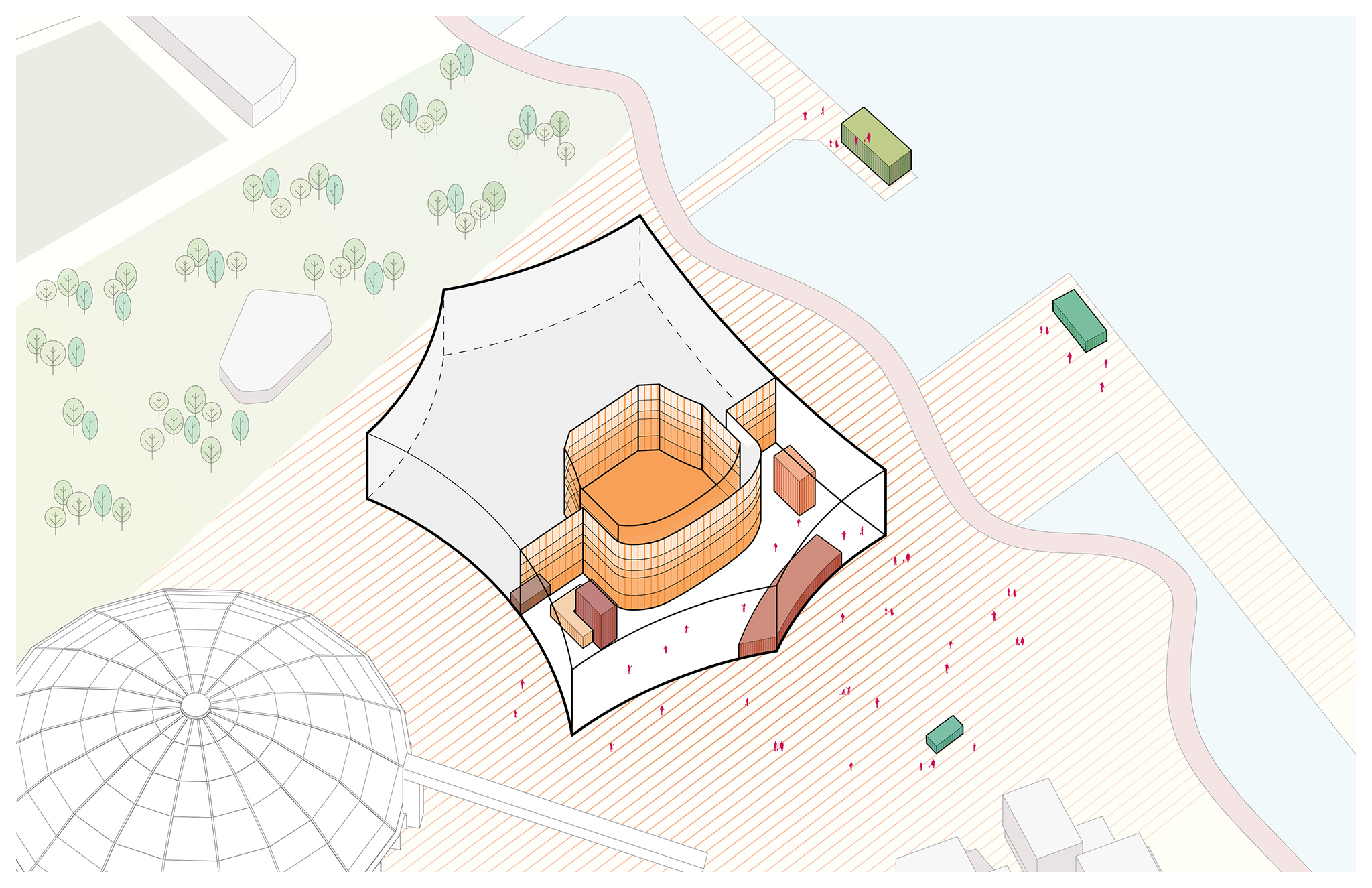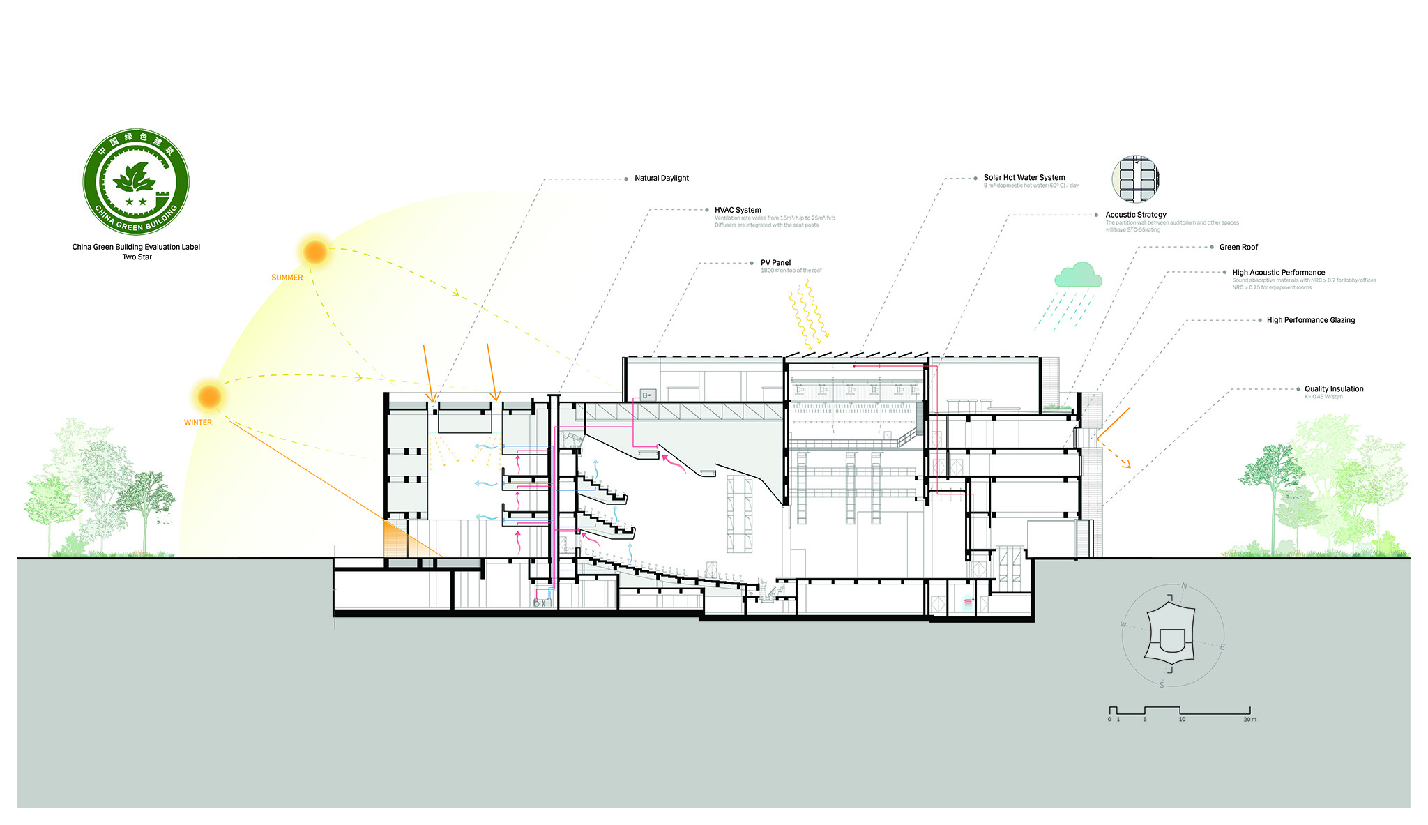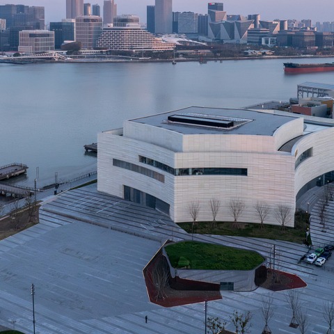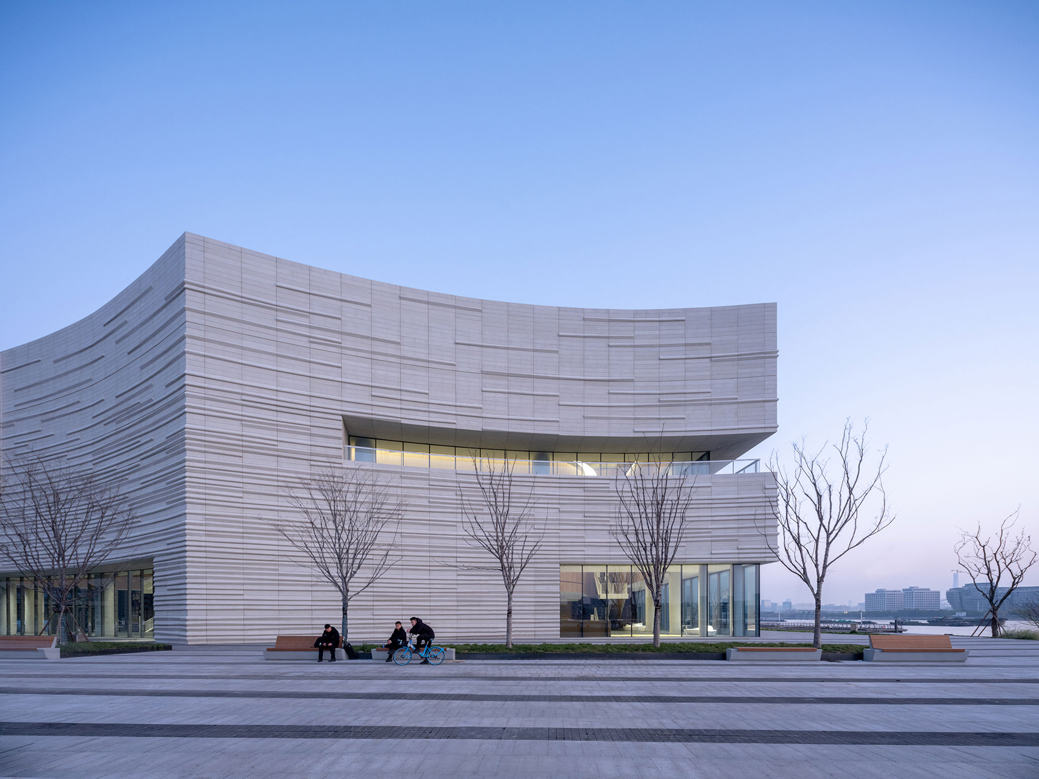 El edificio pretende ser un elemento más del West Bund, situándose junto al río con una escala similar a la de los barcos que lo transitan, y relacionándose con la gran plaza exterior para enfatizar su carácter público. Su aspecto imponente y tectónico se ha logrado no solo por su gran escala, sino también gracias al uso de hormigón armado reforzado con fibra de vidrio como acabado de la envolvente. Esta fachada de formas orgánicas aporta dinamismo al proyecto y funciona, además, como un homenaje al río Huang Pu, imitando su constante movimiento.