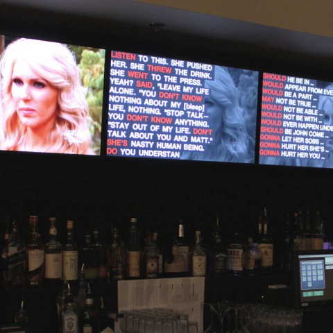 Utillaje: Regular HP desktop de ordenador, nVidia tarjeta de gráficos, 2 x Matrox DualHeadToGo external DVI doublers, 5 x 40 ” Samsung LCD’s, C++, openFrameworks & a custom-hacked version de biblioteca vídeoInput de Theo Watson para procesar información en Closed Caption.