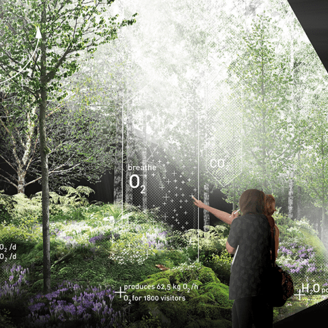 El ganador del concurso de diseño fue el team.breathe.austria equipo interdisciplinar, compuesto por representantes de la Universidad Técnica de Graz y la Universidad de Viena de Recursos Naturales y Ciencias Aplicadas (BOKU). Su investigación se centra en la ecología, la energía y el cambio social en el medio ambiente. La estrategia de autonomía energética de breathe.austria en el Nº 1 de los medios para la vida: el aire. La totalidad, de los 560 m² de superficie de exposición se han planteado con plantas austriacas y toda la vegetación desde arbustos a árboles grandes se ejecutará a través de un ciclo anual regular durante la vigencia de la EXPO. Con este concepto, respirar, se combina la estructura y el medio ambiente en un aporte integrado y hace una declaración para una relación sostenible entre la vida urbana y la naturaleza que se puede experimentar personalmente. "Aprovechamos la fuerte identificación del nuestro aire y la de calidad de vida en Austria y llamamos la atención sobre el alto nivel de competencia ecológica y técnica en Austria. En línea con el lema "Energía para la Vida", creamos un pabellón para la respiración, con un ambiente que se siente como un espeso bosque en Austria. ! Una bocanada de nuestro bosque austriaco permanecerá en sus pulmones durante dos años", exclamó Klaus. K. Loenhart, autor del proyecto ganador.