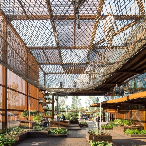 La idea inspiradora de una red flexible, suave y descentralizada está presente en todos los aspectos de la construcción y representa la pluralidad del país. En medio de más de 130 construcciones, el Pabellon de Brasil propone una pausa, la intención de crear una plaza pública que atraiga a la gente y genere curiosidad. Tan porosa como la cultura brasileña, se trata de un gran volumen abierto al público y que establece una vía entre varias especies de plantas cultivadas en nuestro país. Los colores tierra de la estructura de hierro destacan esta "brasileñidad" y la transición gradual entre el dentro y fuera borrando los límites entre arquitectura y escenografía. La metáfora de la red se materializa por una estructura de tracción que crea lugares inesperados para el ocio y el descanso. Siguiendo la tradición del modernismo brasileño y sus pabellones, grandes rampas refuerzan las conexiones entre los diferentes espacios.