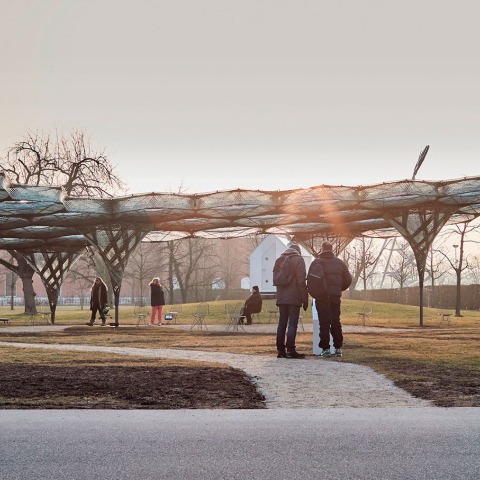 Experimental architect Achim Menges together with Moritz Dörstelmann, structural engineer Jan Knippers and climate engineer Thomas Auer have pioneered a unique robotic fabrication technique developed by the University of Stuttgart’s Institute for Computational Design (ICD) and the Institute of Building Structures and Structural Design (). This technique, developed by the team over several years of research, involves a novel way of winding composite materials. The innovative winding method has been designed to harness carbon fibres and give them strength as woven structural components. A series of these individual cell-like modules has been used to create the pavilion’s distinctive shape, integrating the processes of design and engineering. The project explores the impact of emerging computational and robotic technologies on these disciplines.