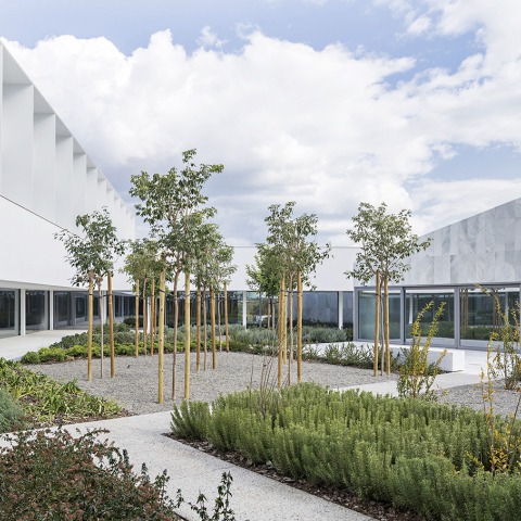 La red de caminos del parque se adapta de forma natural a la topografía original y conecta los distintos edificios mientras navega por un rico jardín de especies autóctonas y mediterráneas. Los árboles se agrupan en función de la gestión del agua para minimizar el mantenimiento, a la vez que crean puntos de sombra y calma en todo el campus. Se plantan especies adicionales para mejorar la regeneración natural del suelo actual y para que el parque sea sostenible a largo plazo.